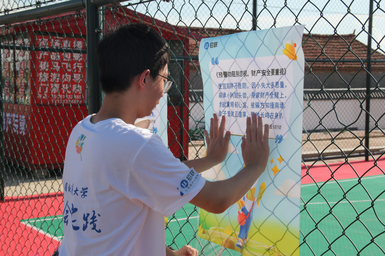 图为实践团成员在村里张贴招联提供的反诈宣传海报。中国青年网通讯员 姚茗方 摄