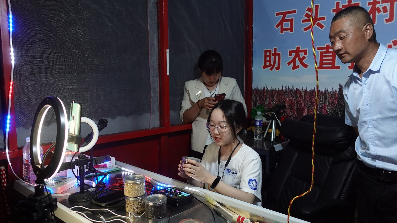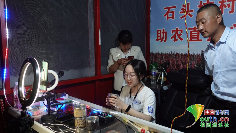 图为成员在石头坑村助农直播间体验、助力“藜麦哥“直播带货,对“电商+农业”这一产业模式有了更实际的了解。中国青年网通讯员 李明旻 摄