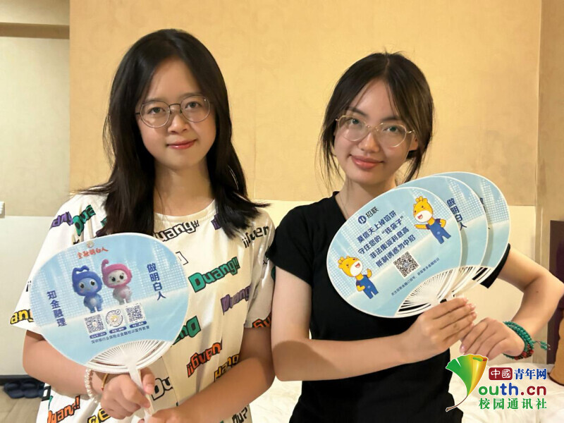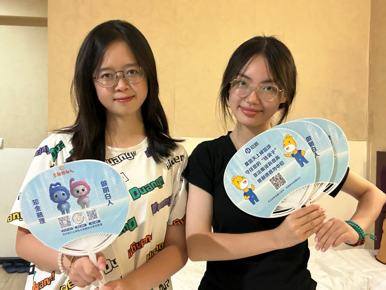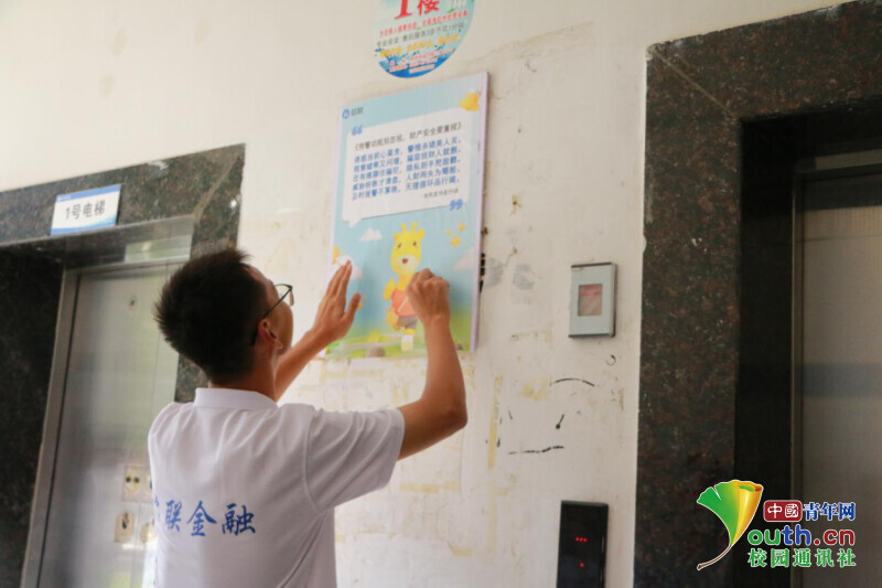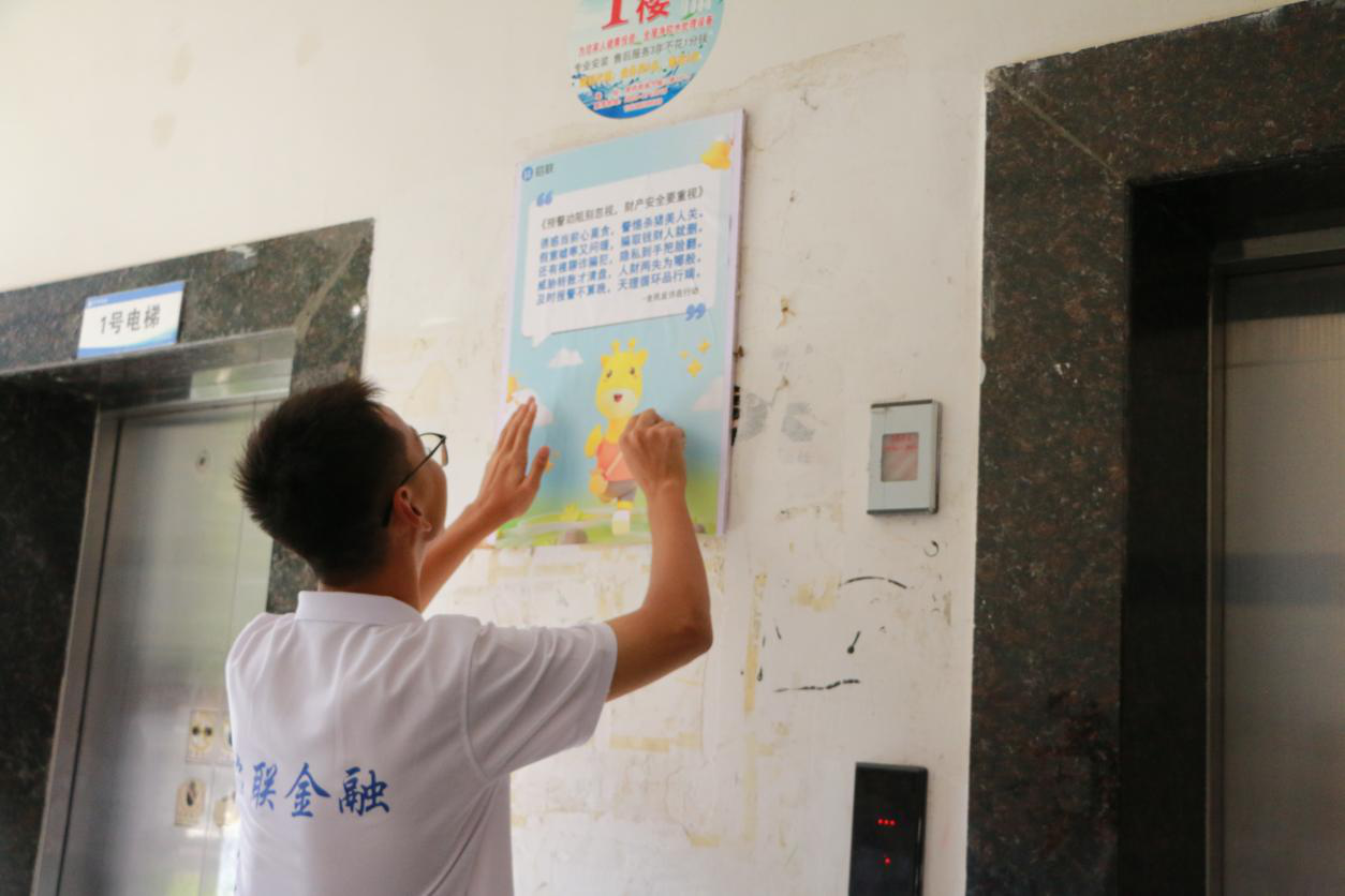 接着成员们在社区公示栏及居民楼电梯入口处贴上招联提供的防诈骗宣传海报,并积极地给沿途偶遇的居民科普防诈骗相关知识、分发招联提供的金融明白人消保宣传扇子、守住钱袋子、防网络诈骗、防电信诈骗等折页宣传物料。实践团成员致力于将防诈骗相关知识传播给当地居民,减少受骗人数,为社会的和谐安定贡献一份力量。