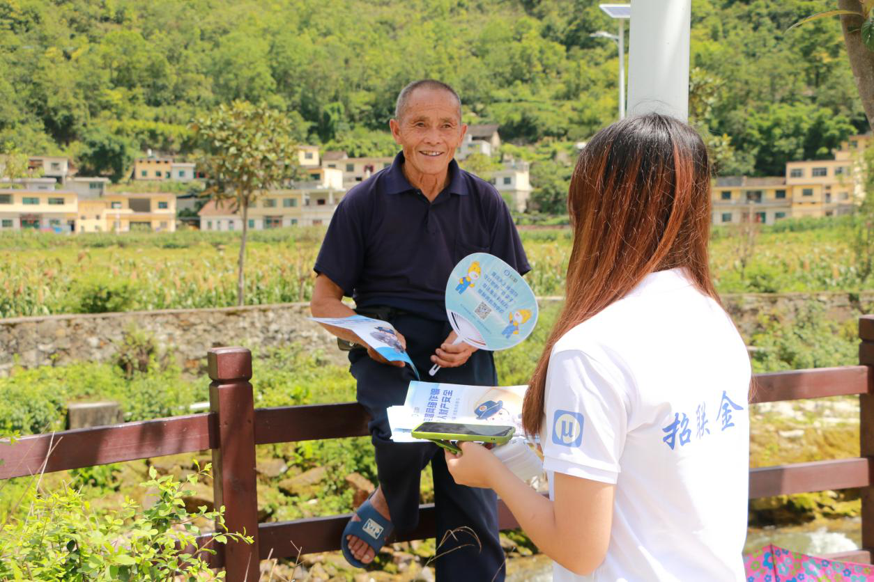 图为实践团成员在坛坪村和村民们就“金融消费者权益保护知识”展开交谈,赠送招联提供的“守住钱袋子“宣传册及“金融明白人”宣传扇子。中国青年网通讯员 戈婧懿 摄