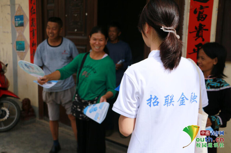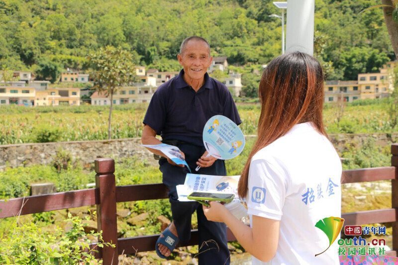 图为实践团成员在坛坪村为村民们介绍金融安全知识,发放招联提供的“守住钱袋子”宣传册及“金融明白人”宣传扇子。中国青年网通讯员 戈婧懿 摄