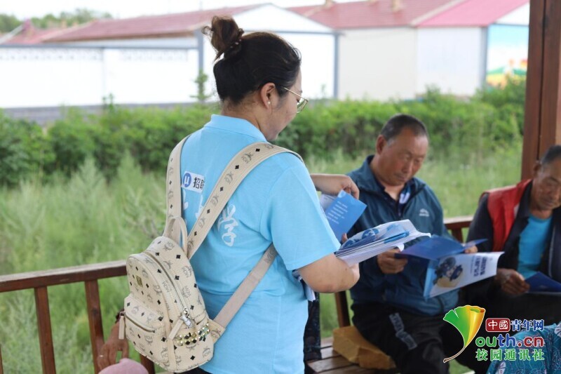 图为实践队成员为村民发放招联提供的守住钱袋子宣传册及相关反诈骗资料。中国青年网通讯员 曹娜 供图
