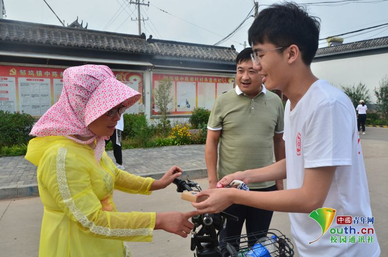 实践队员正在用自制的中药香包手工皂和与村民换取过期药品。中国青年网通讯员 任建威 供图