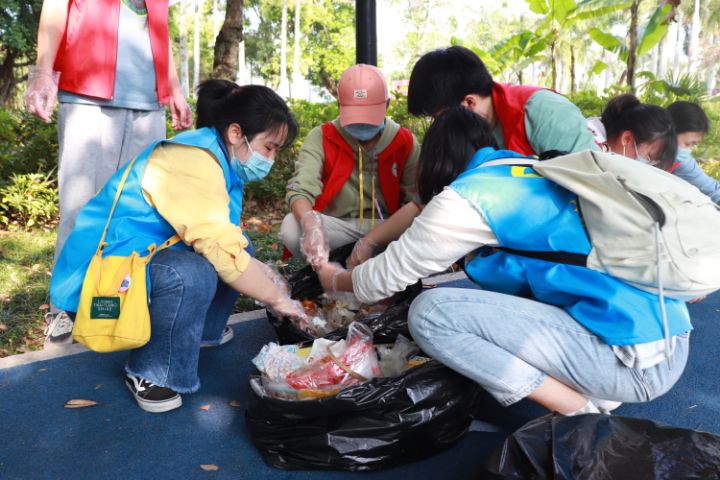 图为志愿者们将捡拾的垃圾进行垃圾分类。 中国青年网通讯员 王璐璐 摄