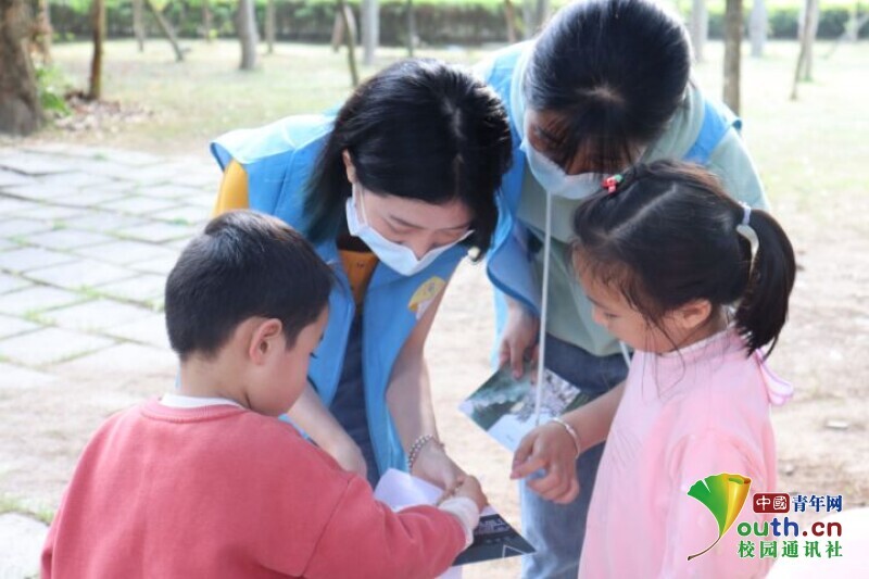 图为志愿者向小朋友讲解pH比色卡的使用、判别方法 。中国青年网通讯员 王璐璐
