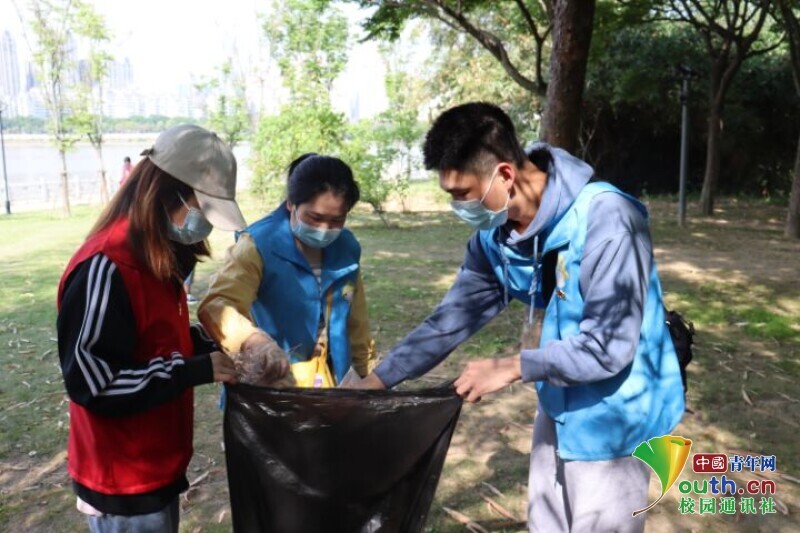 图为志愿者们在公园路段捡拾垃圾 。中国青年网通讯员 王璐璐 摄