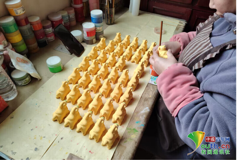 图为手艺人为泥咕咕上色过程。梁诗婷 供图