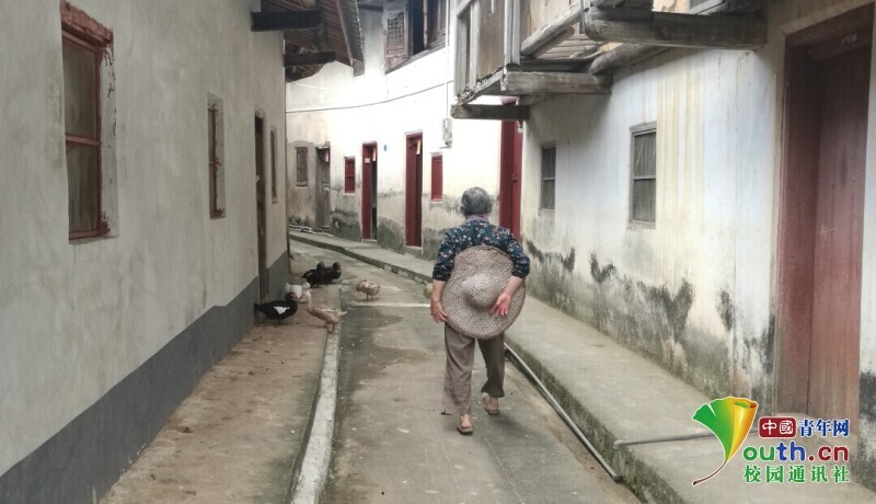 图为东岭村婆婆带领队员们参观村巷。中国青年网通讯员 李倩婷 摄