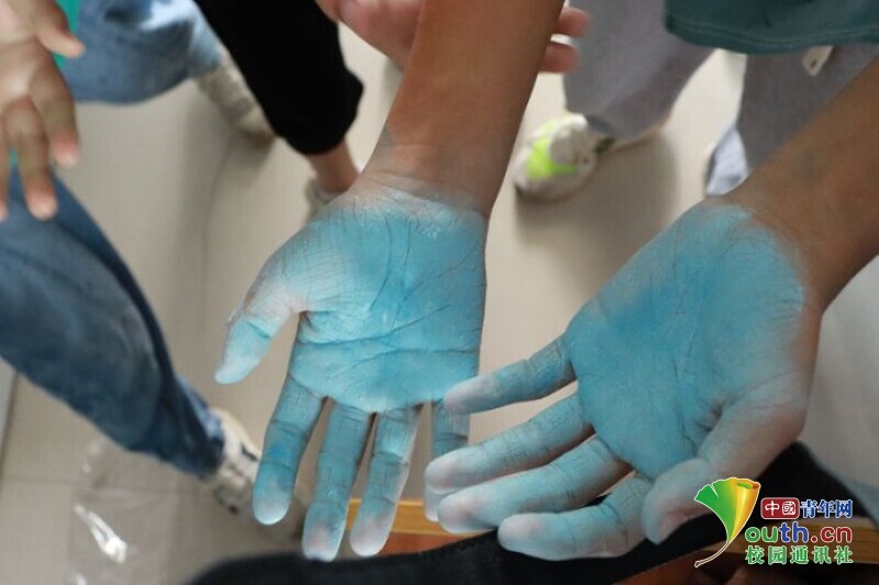 图为学生沾满颜料的双手。中国青年网通讯员 彭雅静 摄
