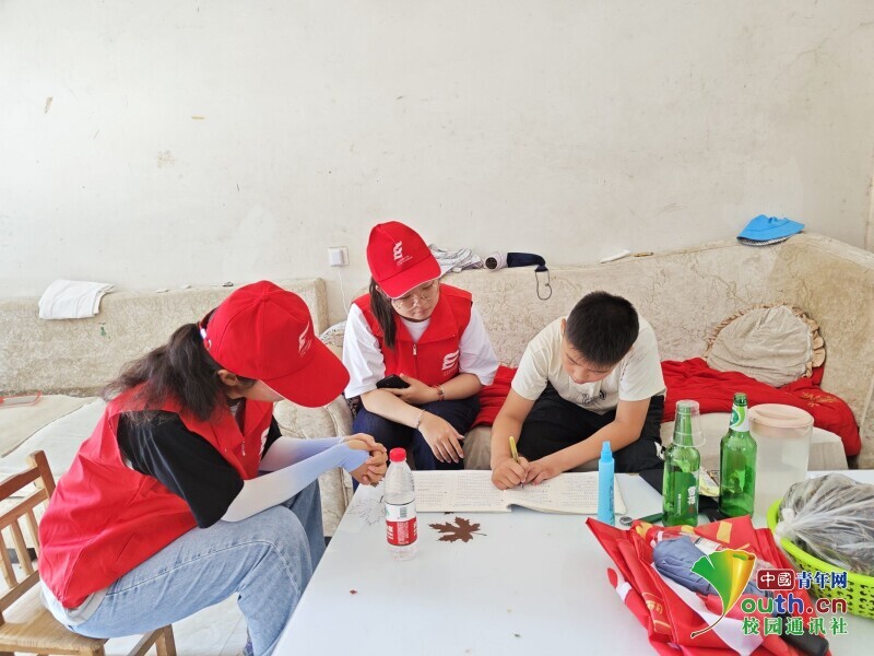 图为两位团队成员在为学生辅导作业。中国青年网通讯员 吴嘉玥 供图