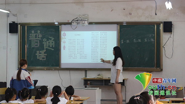 图为实践队员杨暄为孩子们教授普通话。中国青年网通讯员 吴雅莉 摄