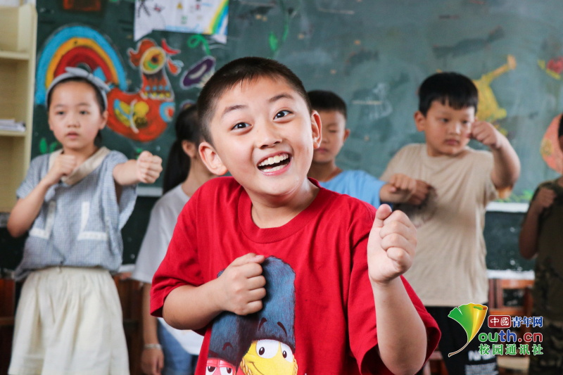图为这次下乡还开设了“震藩武门”课堂,震藩武门是以“中华散手”为特色的课程。这节课上,刘洋老师正在教小朋友们前后手直拳,一位小男孩打着拳,被对面小伙伴的动作给逗笑了。中国青年网通讯员 蒋睿琦 摄