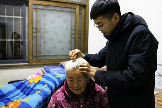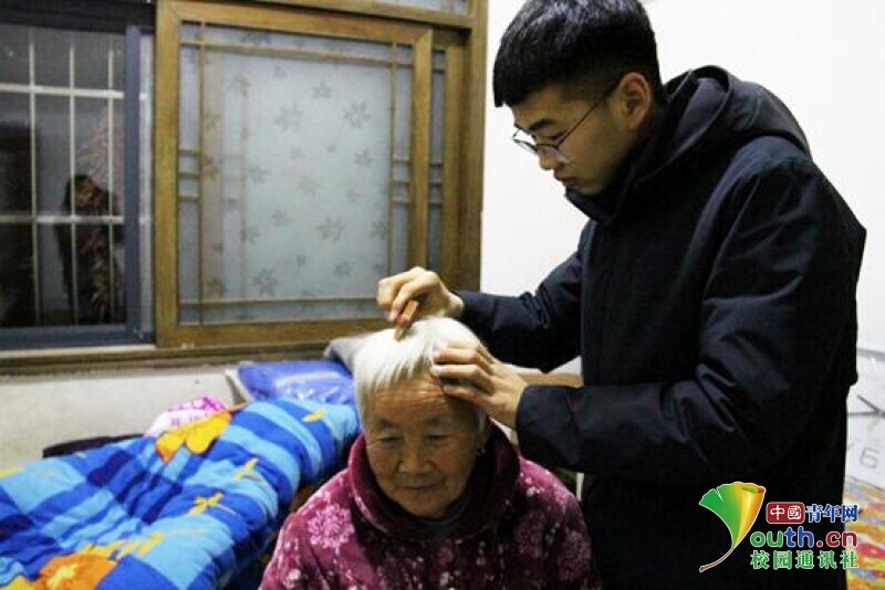 图为志愿者帮老人梳理头发。中国青年网通讯员 冯庆恩 摄