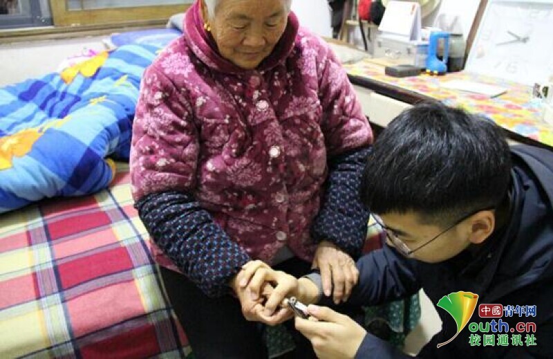 图为志愿者帮老人剪指甲,清洁卫生。中国青年网通讯员 冯庆恩 摄