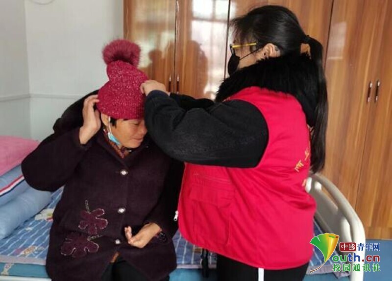 图为志愿者正在试戴冬天为老人准备的帽子。中国青年网通讯员 冯庆恩 摄