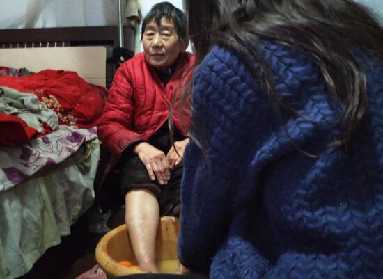 图为志愿者一边为老人洗脚一边给老人普及泡脚的重要。中国青年网通讯员 孔慧玲 摄