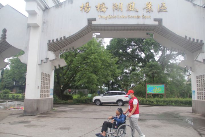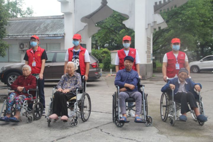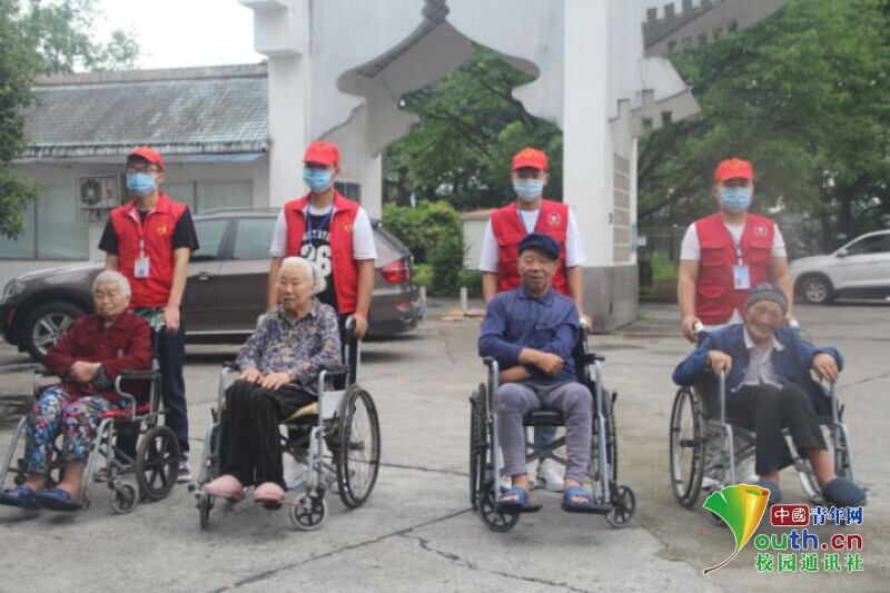 图为志愿者带老人散步,减轻老人内心的孤寂。中国青年网通讯员曾诚宇 摄