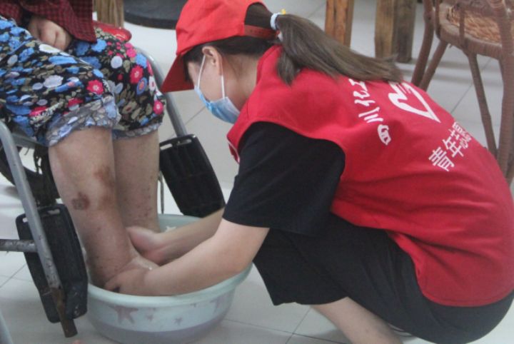 ?图为志愿者帮老人洗脚,让老人重获温暖。中国青年网通讯员涂子阳 摄?