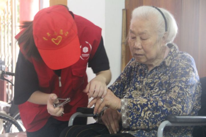 ??图为细心的志愿者为老人修剪手指甲。中国青年网通讯员张富贵 摄
