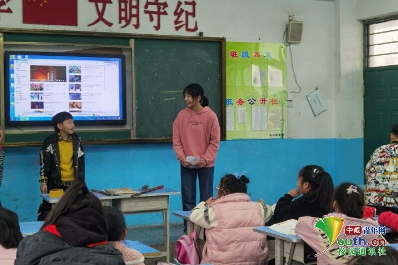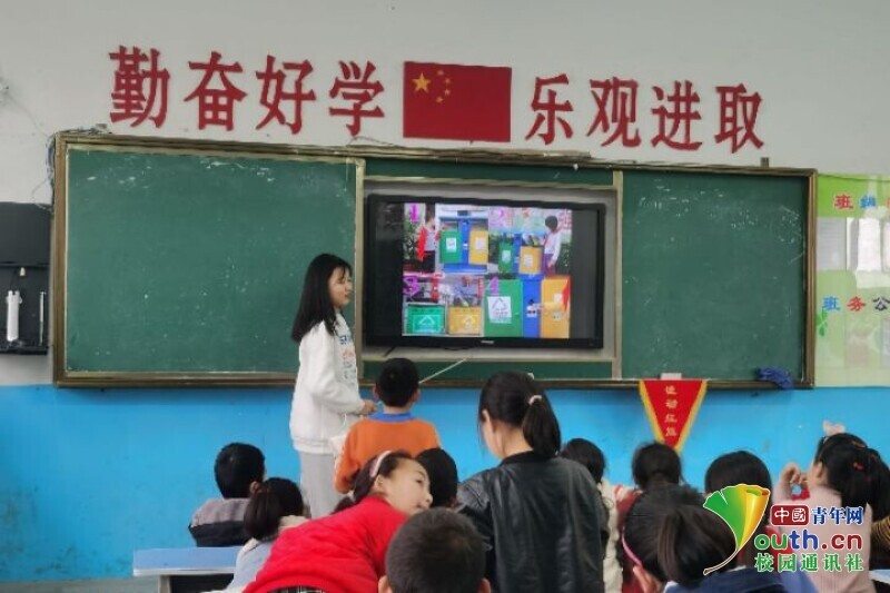 图为??志愿者为小朋友讲解“节约用水”主题PPT。中国青年网通讯员 李金玉 供图