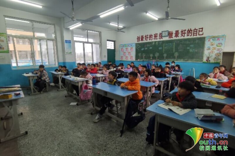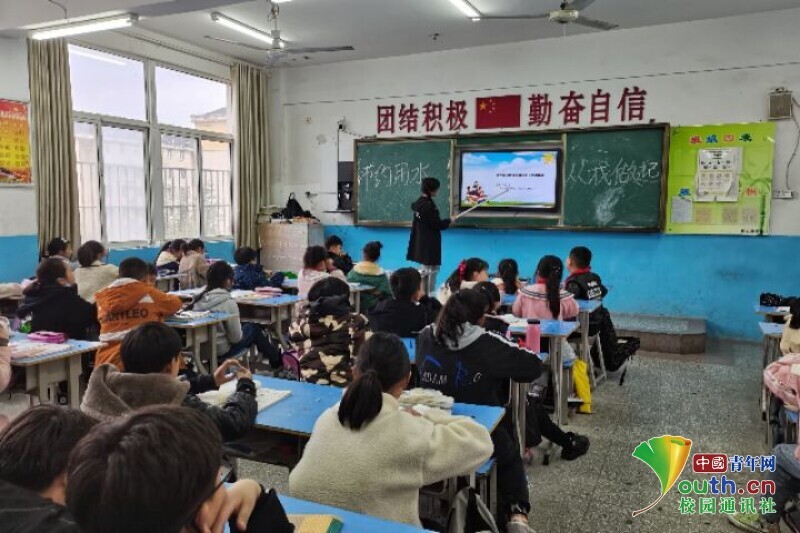 ??图为小朋友安静的坐在座位上听志愿者讲节约用水知识。中国青年网通讯员 李金玉 供图