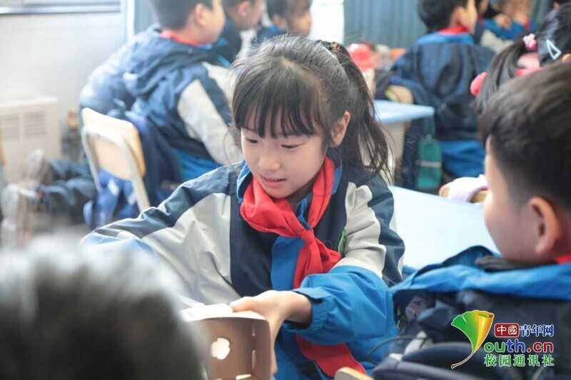 “VR科技初体验”环节,课堂气氛热烈。志愿者用贴近儿童认知的语言讲解虚拟现实技术的基本原理。孩子们分组领取纸板模板、透镜、魔术贴等材料,在志愿者协助下动手裁剪、折叠、组装,一步步制作出自己的简易VR眼镜。