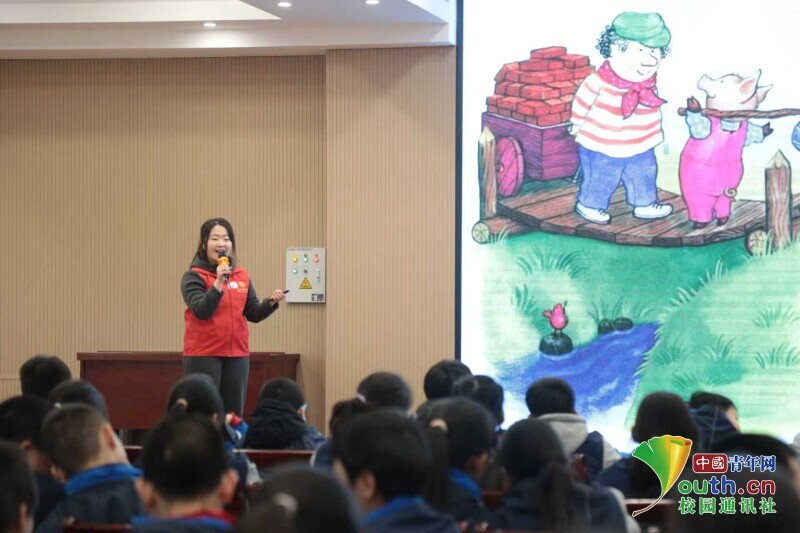 在五年级教室,一堂别开生面的“英语绘本戏剧课”正热烈进行。志愿者以经典故事《三只小猪》为脚本,引导孩子们学习相关台词与表达,并分角色进行情景扮演。孩子们有的扮演机智勤劳的小猪,有的尝试演绎固执的大灰狼,在轻松愉快的氛围中大胆开口,用英语对话推进剧情。