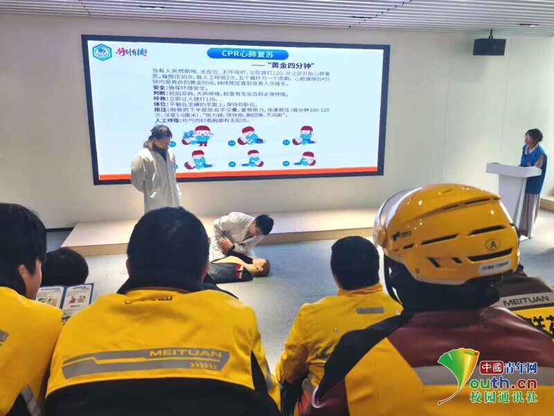 培训现场,志愿者手持急救模拟人,细致演示心肺复苏标准操作:“按压时手臂保持垂直,成人按压深度5-6厘米,频率每分钟100-120次。”专业讲解搭配精准示范,让骑手们清晰掌握操作要点。
