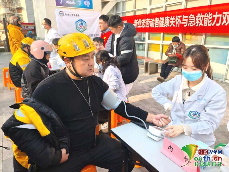 同日,果园社区的“健康加油站”同样热闹非凡,红色的志愿横幅下,骑手们有序排队,等待接受专业健康服务。该服务点由南通大学医学院博硕士研究生和留学生志愿者共同搭建,提供血压、血糖检测及内、眼、外科等多方位基础筛查服务。