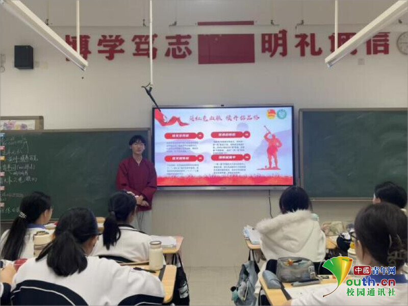 在贵州省遵义市的一所中学里,队员唐瑶紧扣“长征胜利90周年”主题开展宣讲。她摒弃单向灌输,运用“视觉叙事”的创新方法,用一张张调研中采集的历史照片、文物复刻图,将“半床棉被”“金色鱼钩”等经典故事娓娓道来。面对同学们“红军如何在艰苦中坚守”的提问,她顺势引导同学们换位思考“倘若你身处逆境该如何守护信仰”,让课堂从历史的聆听场转变为青春的思辨场,让红色精神在互动中深植心间。