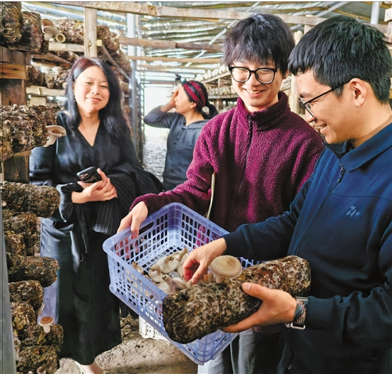 浙江庆元香菇“科技小院”研究生吴杰焘(右一)、芮利群(右二),在丽水学院教师吴庆红(左一)的指导下在庆元大坑村菇民家观察香菇长势。图片由受访者提供