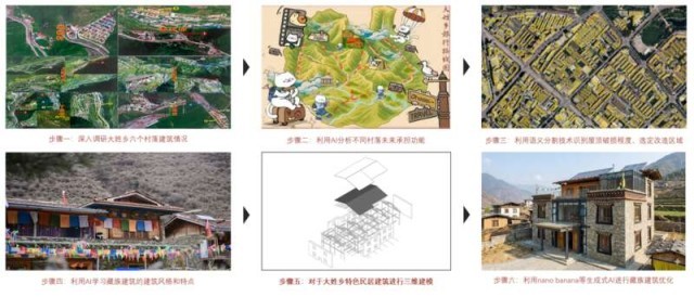 团队调研发现,大姓乡可依托 AI 技术破解传统建筑发展难题,实现建筑保护与文旅发展的双向赋能。在核心建筑改造上,可对闲置集体建筑、老旧民居进行功能置换设计,推动民居改民宿、仓库改工坊、祠堂改民俗展演空间等,充分盘活闲置建筑资源。配套建筑新建过程中,可通过 AI 设计确保游客服务中心、补给站、体验工坊等新建建筑与周边藏羌建筑风貌协调统一。同时,通过 AI 空间算法优化建筑内部布局,能有效提升文旅服务效率与游客体验感,更可将藏羌建筑元素融入建筑细节设计。